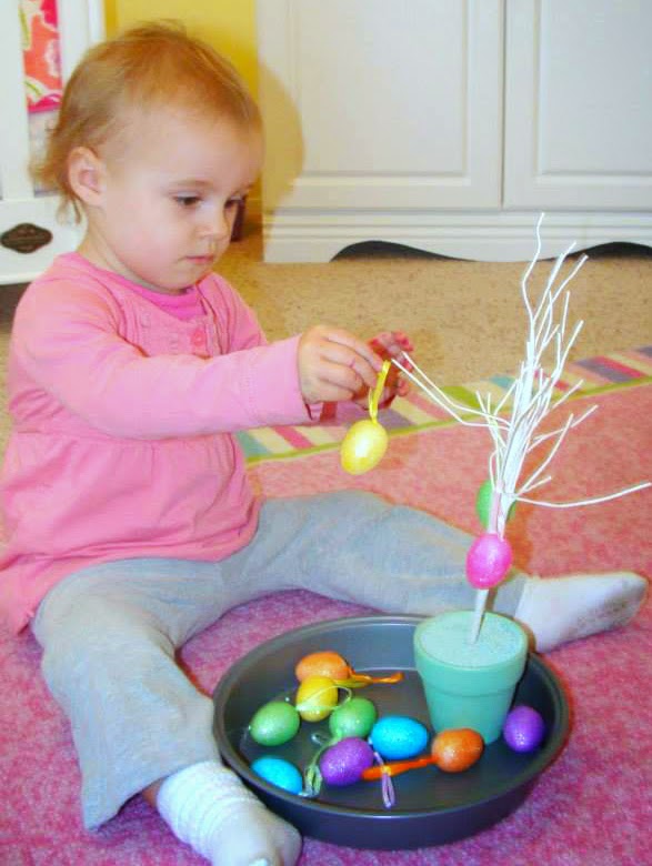 When my daughter was a toddler, I started searching for ideas for teaching her at home. I found many ideas for sensory play, so I started experimenting with making her some home-made sensory toys and games. I would pick a theme that went along with the season and go gather supplies at the dollar tree. For Easter, she had a little tree to hang egg ornaments on.